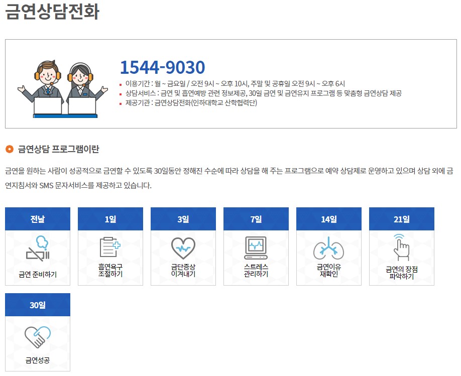 출처 : 국가금연지원센터 4. 금연상담전화 : 언제, 어디서나 금연상담전화를 통해 30일간 전문적인 금연프로그램 이용