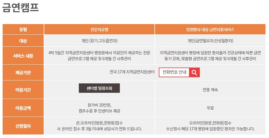 출처 : 국가금연지원센터 2. 금연캠프 : 의료인이 제공하는 4박5일 전문치료형 금연캠프, 입원환자 대상 금연지원서비스를 이용하실 수 있습니다.