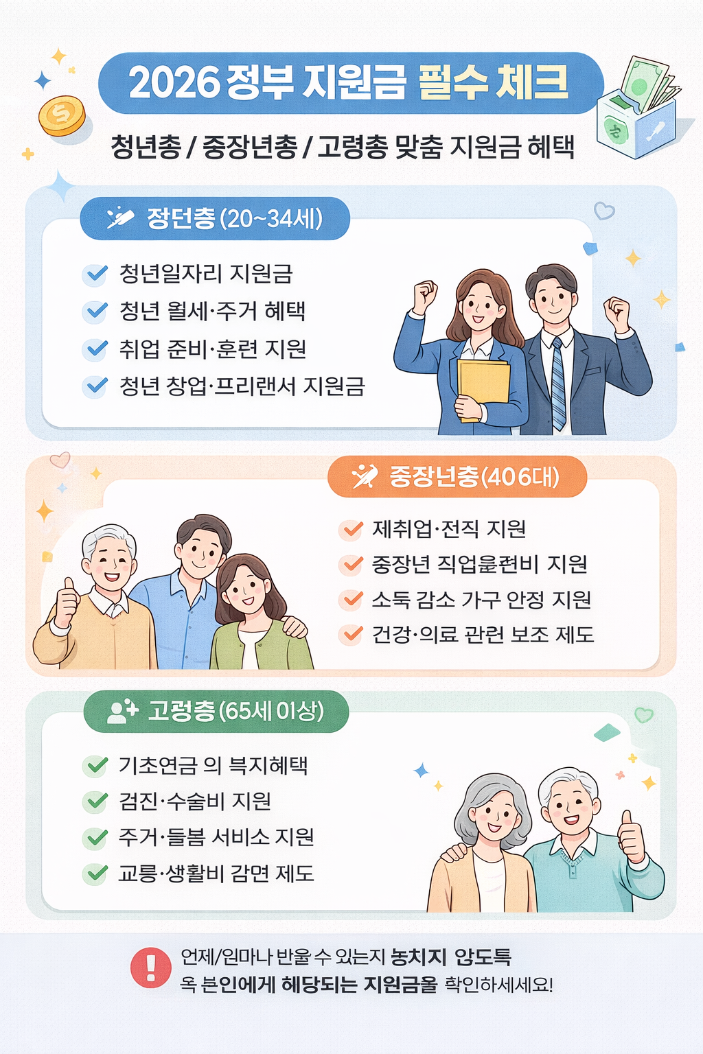 청년·중장년·고령층이 꼭 확인해야 할 정부 지원금만 핵심만 정리해드립니다.📌 목차